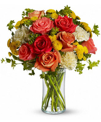 Citrus Kissed is a stunning bouquet that captures the essence of summer with its vibrant colors and nature's finest picks. This beautiful arrangement features fresh flowers in shades of red, orange, and yellow, including bright chrysanthemums, sunny yellow carnations, and green accents that complete the colorful spectrum.