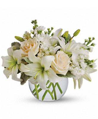 This sophisticated beauty is arranged in a clear, round, transparent glass vase that exudes a timeless, regal look that is perfect for any special event. Place your order for the Isle of White today and let its ethereal beauty enchant your loved ones.